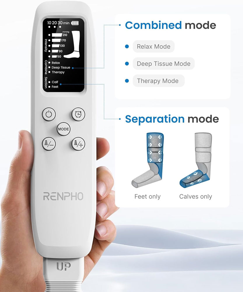 The wearable foot massagers have 5 massage modes and 5 intensity levels. RENPHO recommends them for use by older and less active people, as well as highly active people that spend a lot of time on their feet. Usage time should not exceed 30 minutes per session.