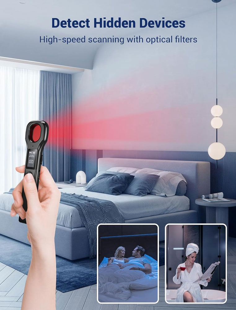 To further help you spy with your little eye, the device has 5 levels of LED sensitivity and 4 location modes for additional control and homing in on the area you're sweeping. Use the high setting for larger rooms, and the low setting for smaller areas, such as bathrooms and dressing rooms, as well as places with shiny, reflective surfaces like plastic and glass.
