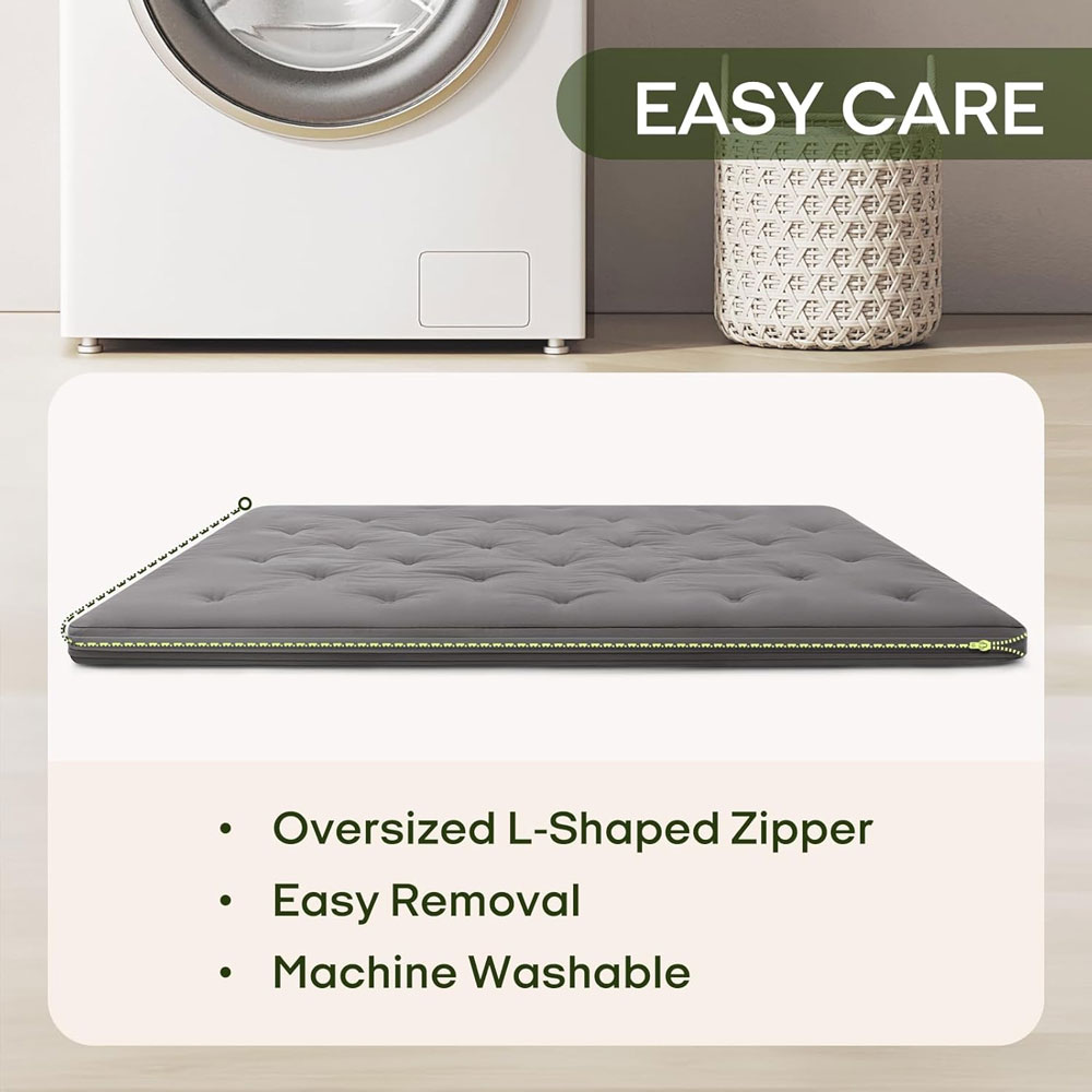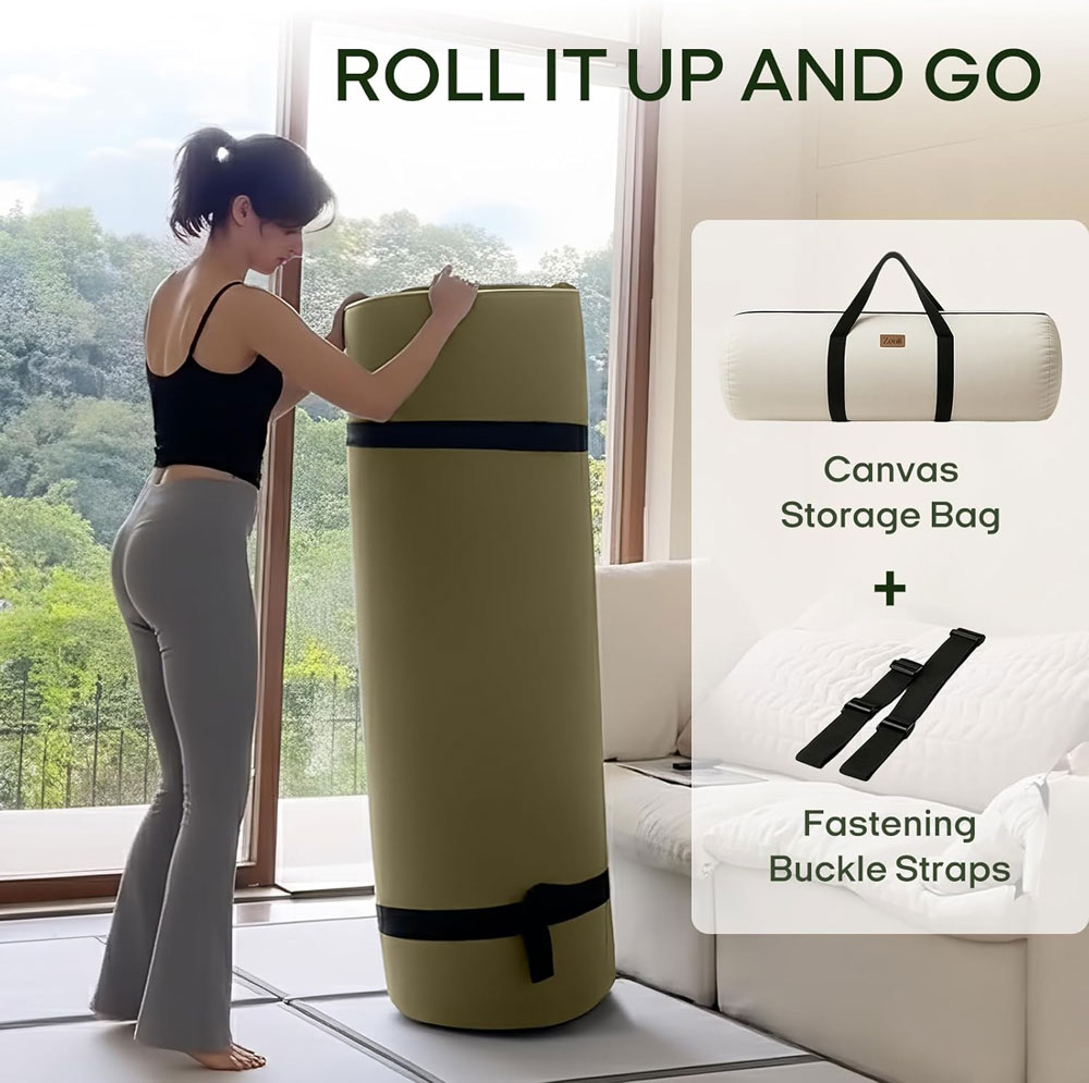 In addition to minimalist bedrooms and guests crashing in the living room, Japanese Floor Mattresses can be rolled up and brought along for use as road trip and camping mattresses. They are made of quilted cotton top and bottom layers, sandwiching hollow fiber and memory foam middles. You have a choice of 2.5" or 4" total thickness.
